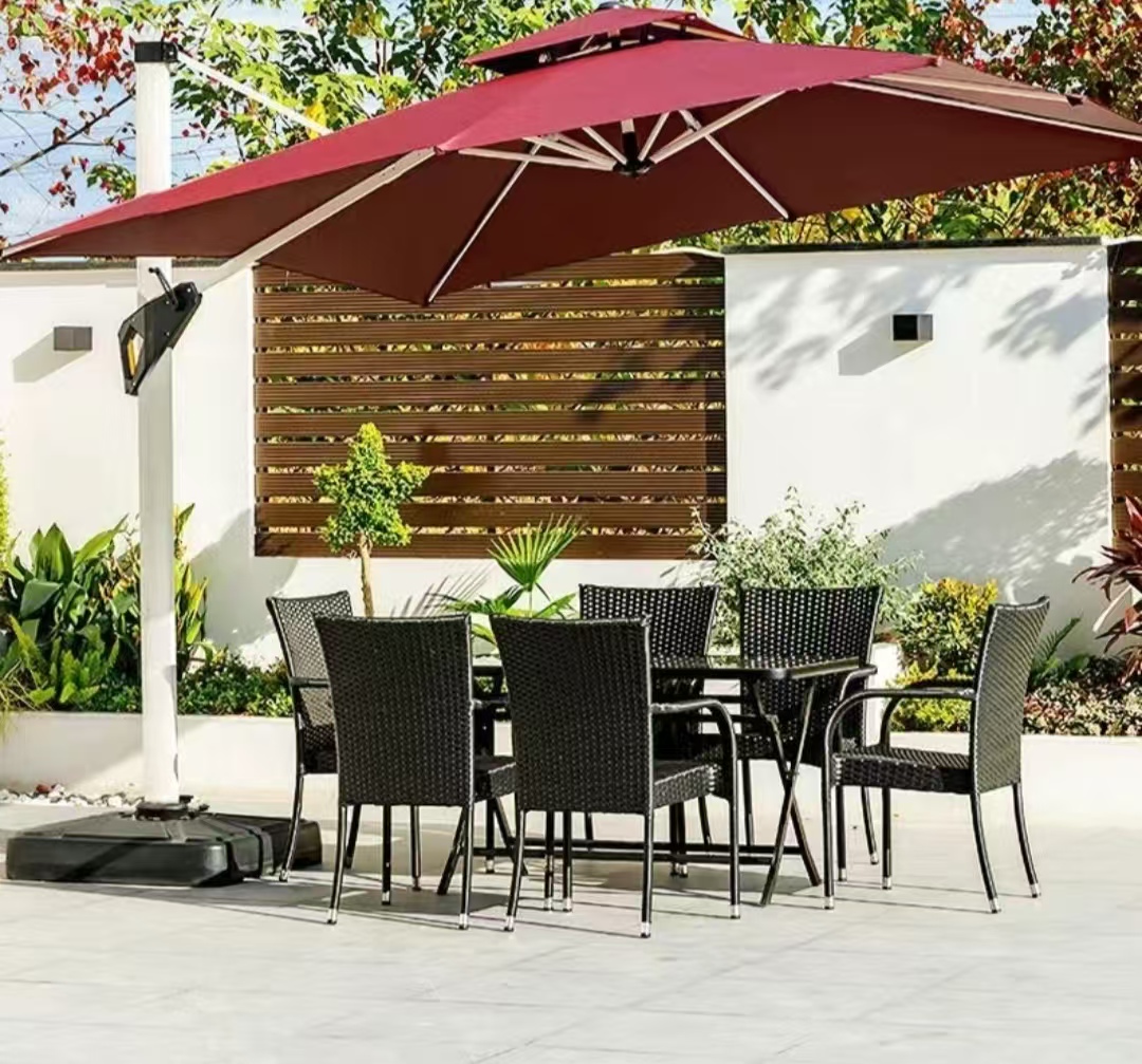 對于家庭用戶而言,庭院遮陽傘與露臺戶外傘是提升居家幸福感的關鍵。若是擁有寬敞花園,花園戶外大傘能覆蓋大面積活動區域,搭配桌椅便成了周末下午茶的理想角落;若陽臺空間有限,小巧的陽臺戶外傘則更為適配,既能阻擋陽光直射,又不占用過多空間。材質上,鋁合金戶外傘憑借輕便耐用的優勢成為主流選擇,而布藝戶外傘則以多樣花色為庭院增添溫馨氛圍。功能上,升降戶外傘可根據日照角度調節高度,旋轉戶外傘能 360 度遮擋陽光,雙頂戶外遮陽傘通過雙層設計增強通風性,即便是炎熱夏日也能保持涼爽。